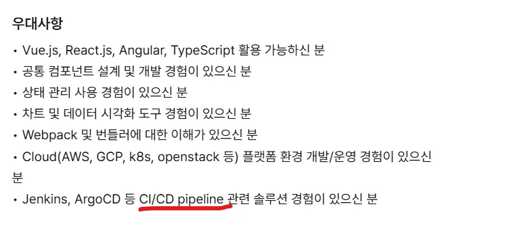 프론트엔드 개발자 공고를 보면 요즘 CI/CD를 요구하는 기업이 종종 보입니다. 이 말은 즉슨 프론트엔드가 개발한 프로덕트가 배포 과정에서 문제가 생겼을 때 어느 부분에서 문제가 발생했는지 확인하고 대응할 수 있어야 하기 때문에 서버 공부를 해야한다(?)고 생각합니다.